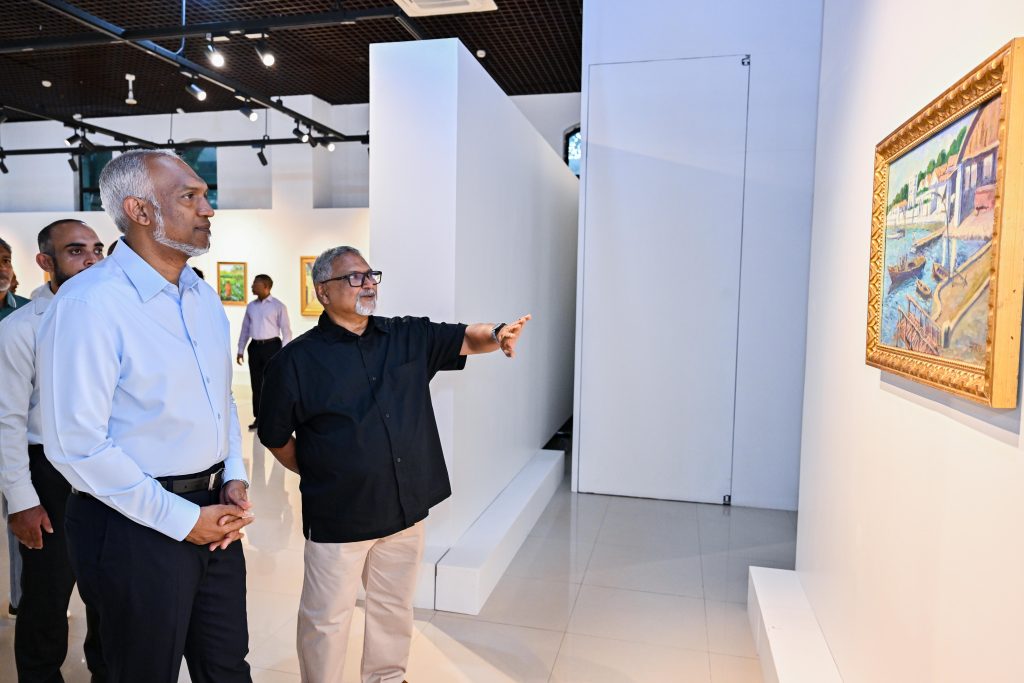 At the National Art Gallery in Malé this week, President Dr. Mohamed Muizzu walked quietly among walls alive with color. He was there for “Ihusaas,” a solo exhibition by Abdulla Faiz, whose impressionist canvases have long celebrated the Maldives’ heritage while stretching into scenes from other shores.
