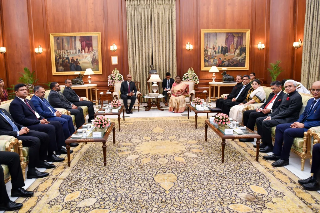 The visit began with a ceremonial welcome at Rashtrapati Bhavan, where President Muizzu and First Lady Sajidha Mohamed received a 21-gun salute and reviewed a Guard of Honour, hosted by Indian President Droupadi Murmu and PM Modi. Later, they laid a wreath at Raj Ghat, honouring Mahatma Gandhi, in a gesture of shared respect.