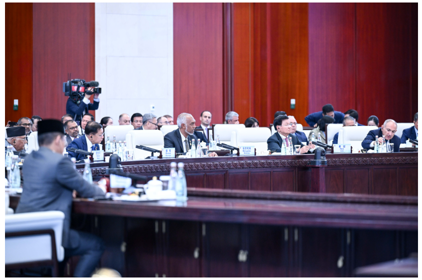 TIANJIN, China, — In a compelling address at the Shanghai Cooperation Organization (SCO) Summit’s “SCO Plus” meeting, President Dr. Mohamed Muizzu called for urgent climate action, enhanced trade connectivity, and a revitalized multilateralism to address global challenges. Speaking to leaders including President Xi Jinping of China at the Tianjin Meijiang Convention and Exhibition Center, President Muizzu outlined three key priorities for collaboration, emphasizing the Maldives’ role as a resilient small island developing state (SIDS) eager to deepen ties with the SCO.